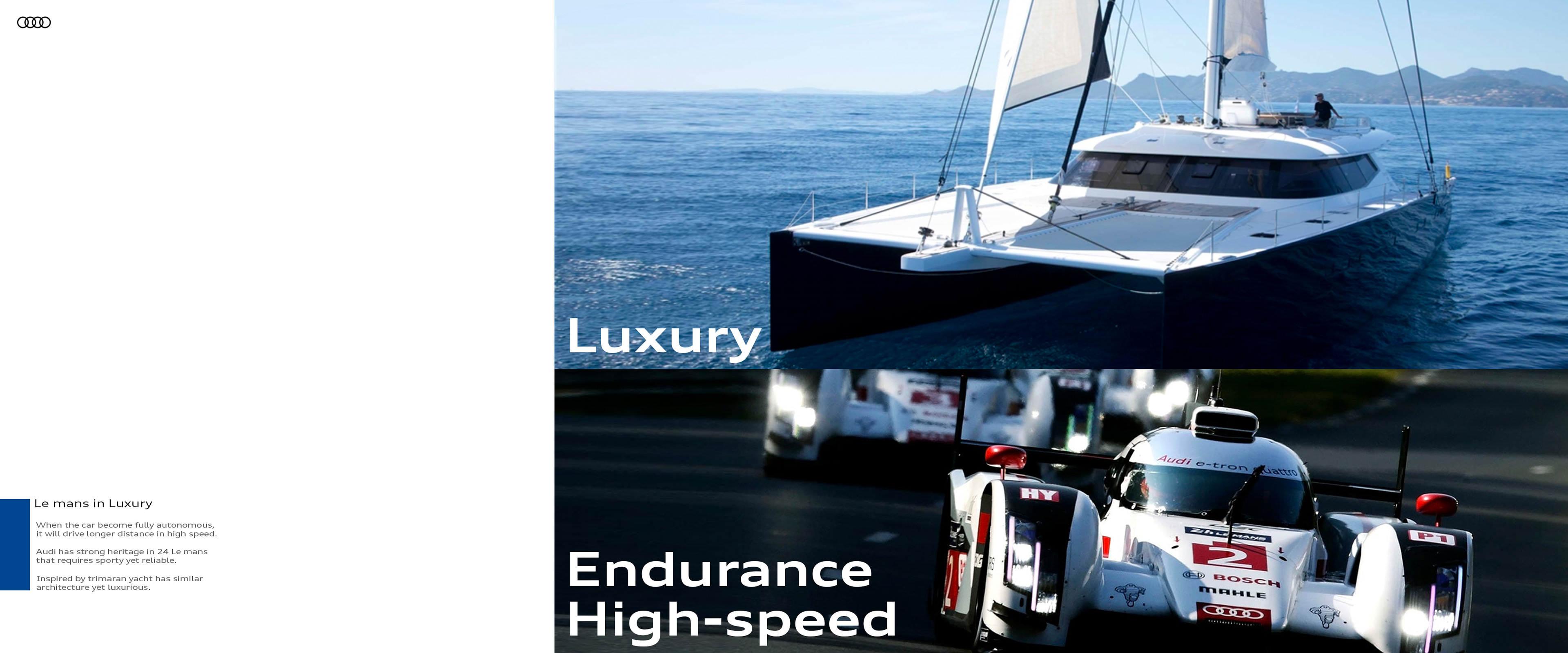 Audi has a strong heritage in 24 Le Mans. What makes Le mans car fast and reliable is the architecture. Creating a car that inspired by Le Mans architecture yet making more luxurious. Inspired by Trimaran because it is the yacht has similar architecture yet luxurious.